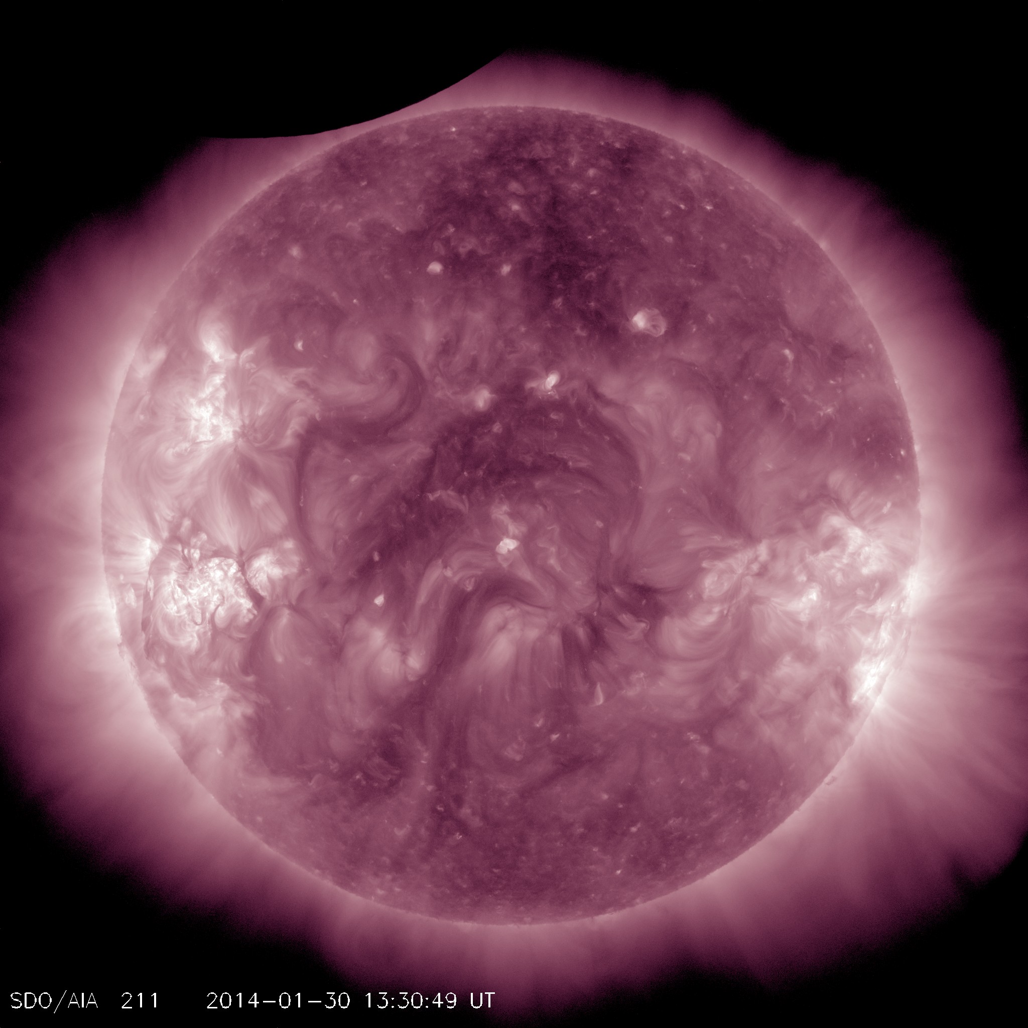 13:44 UT (8:44 EST) – A first glimpse of the moon just before the transit began. Seen in the SDO/AIA 211 angstrom camera.