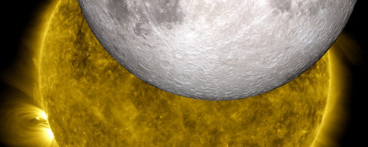 This image is a view of the sun captured by NASA’s Solar Dynamics Observatory on Oct. 7, 2010, while partially obscured by the moon. A close look at the crisp horizon of the moon against the sun shows the outline of lunar mountains. A model of the moon from NASA’s Lunar Reconnaissance Orbiter has been inserted into the picture, showing how perfectly the moon’s true topology fits into the shadow observed by SDO.