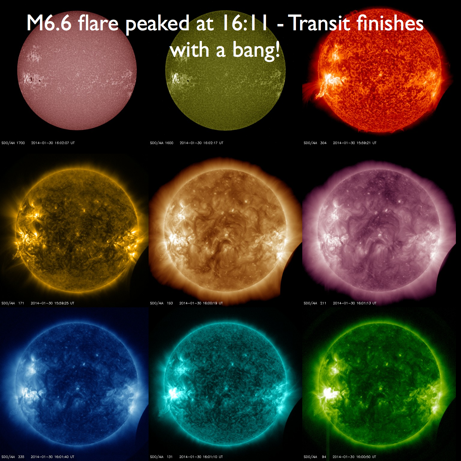 16:17 UT (11:17 UT) – The transit ends with a bang! – an M6.6 flare peaked at 16:11 from AR11967. These images are from just before the flare peak at around 16:00 UT (11:00 EST) again in all 9 SDO/AIA wavelengths.