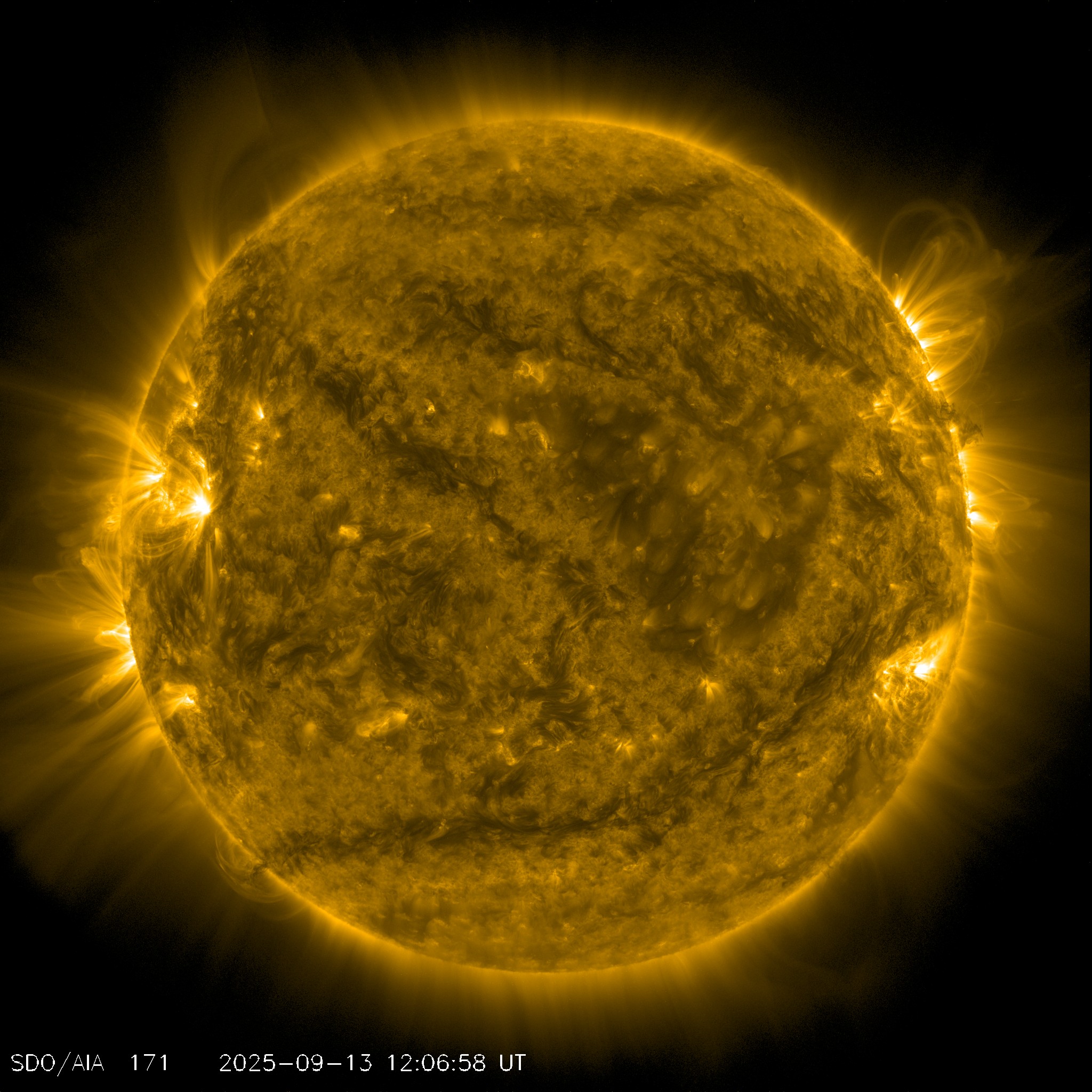 This channel is especially good at showing coronal loops – the arcs extending off of the Sun where plasma moves along magnetic field lines. The brightest spots seen here are locations where the magnetic field near the surface is exceptionally strong.