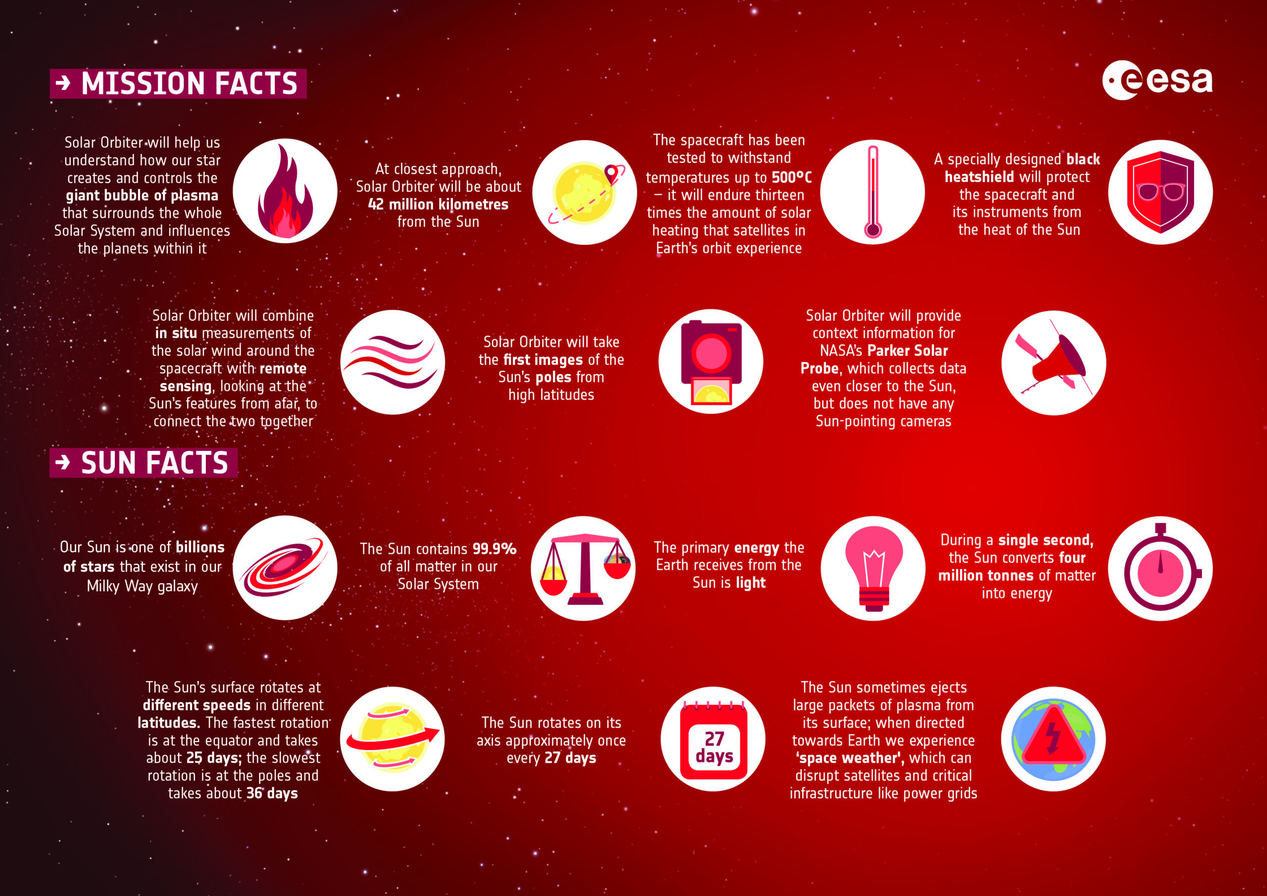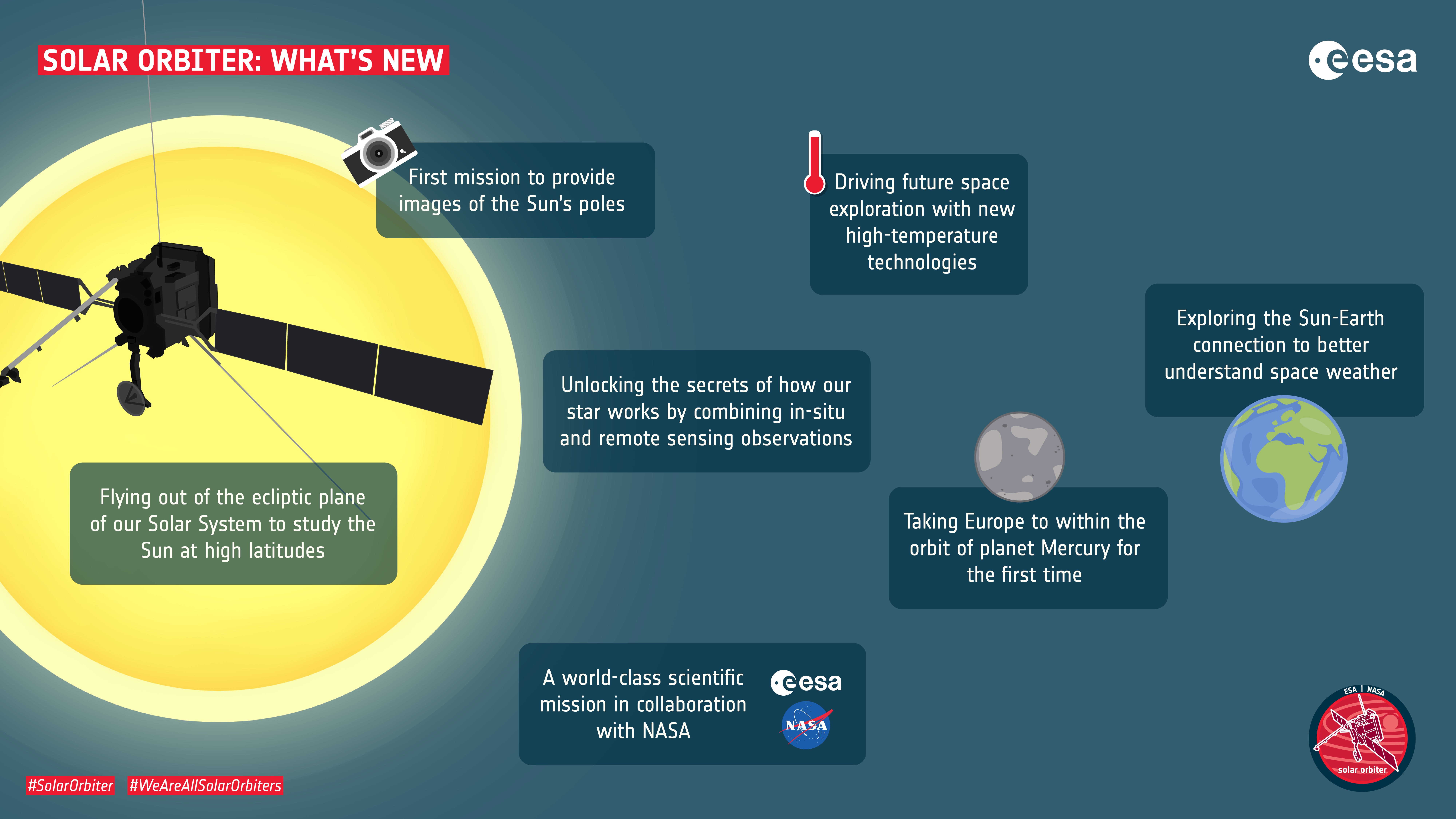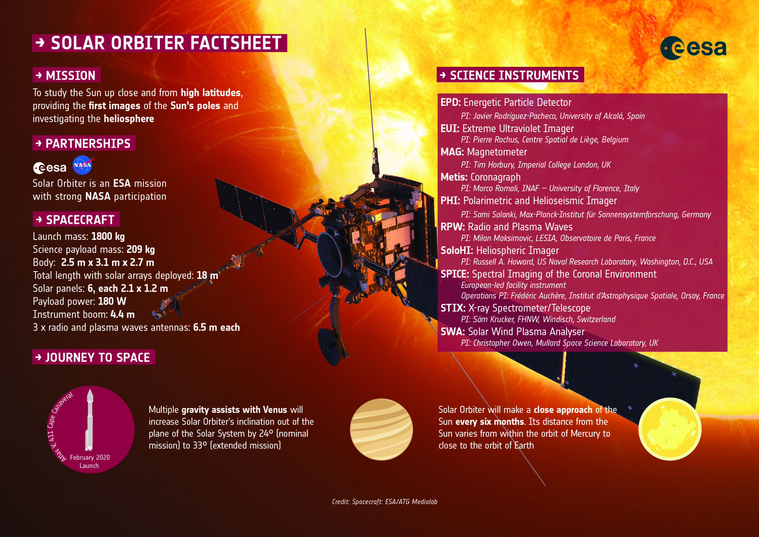 Solar Orbiter factsheet about the mission, partnerships, spacecraft, the science instruments and its journey to space. credit: ESA/ATG medialab