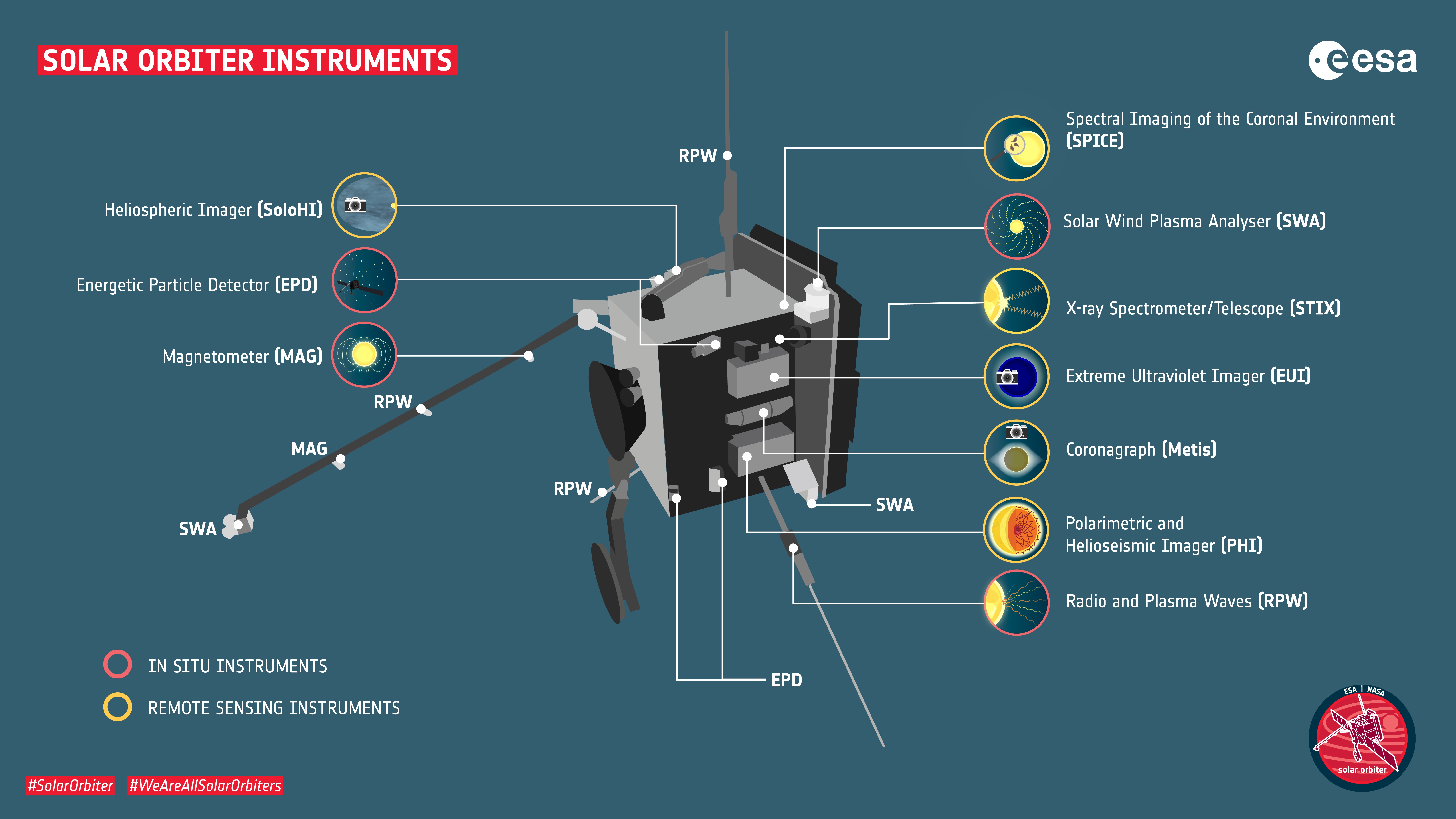 Solar Orbiter’s suite of ten science instruments that will study the Sun. There are two types: in situ and remote sensing. The in situ instruments measure the conditions around the spacecraft itself. The remote-sensing instruments measure what is happening at large distances away. Together, both sets of data can be used to piece together a more complete picture of what is happening in the Sun’s corona and the solar wind. credit: ESA – S.Poletti