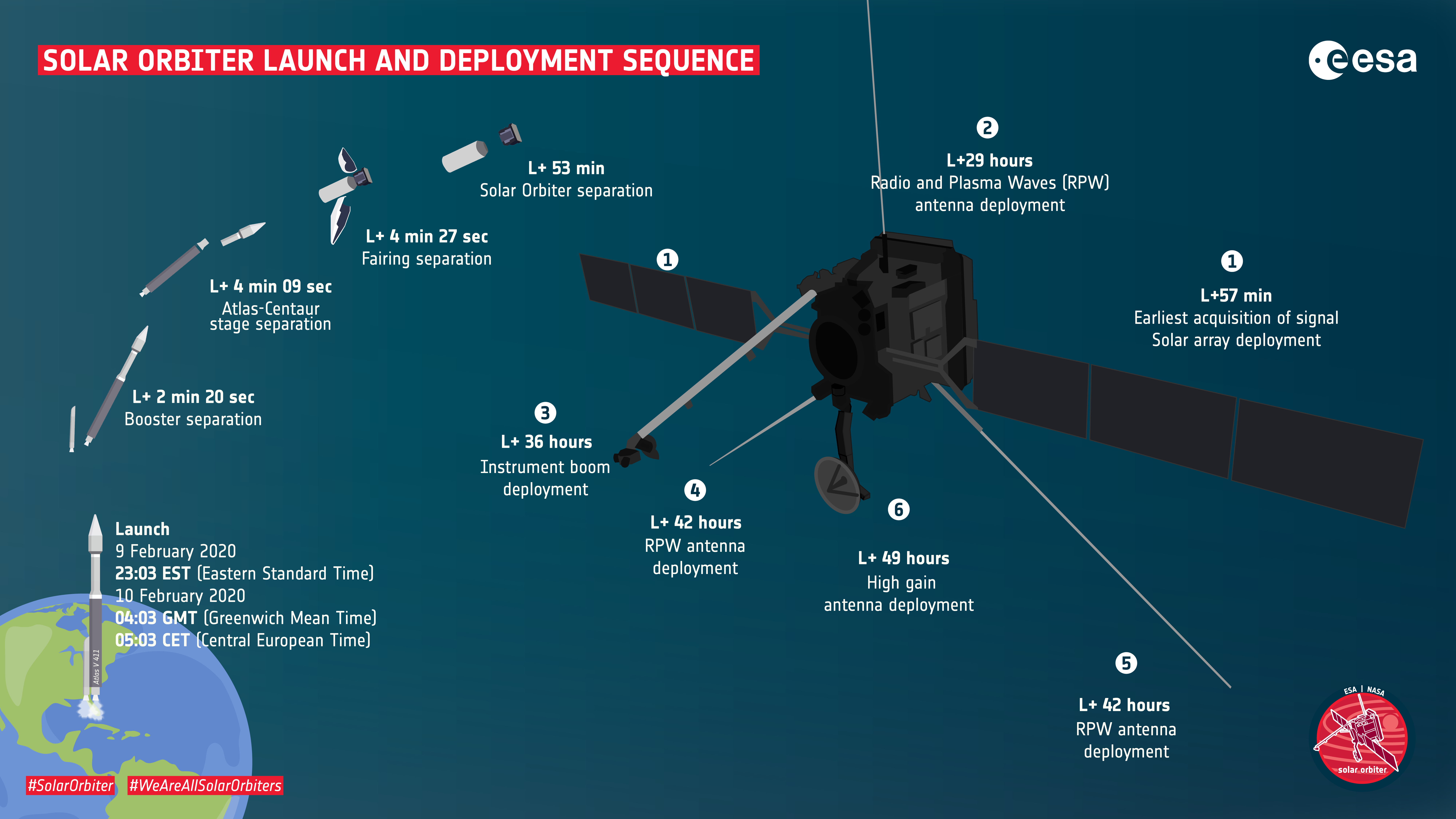 Solar Orbiter is scheduled to launch on an Atlas V 411 rocket from Cape Canaveral in Florida, USA, at 05:03 CET on 8 February 2020 (23:03 EST on 9 February).