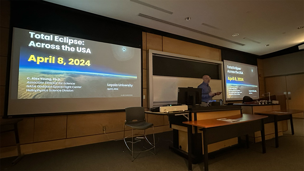On Wednesday, October 11th, Dr. Alex Young, a heliophysicist from NASA’s Goddard Space Flight Center, came to Loyola’s campus to give a talk about the science behind solar eclipses. He discussed the differences between annular and total eclipses, when and where future eclipses will be seen, and many more exciting facts about our sun. Students, faculty, and people from the community came to listen to Dr. Young’s presentation. More about Loyola’s Eclipse Week 2023 »