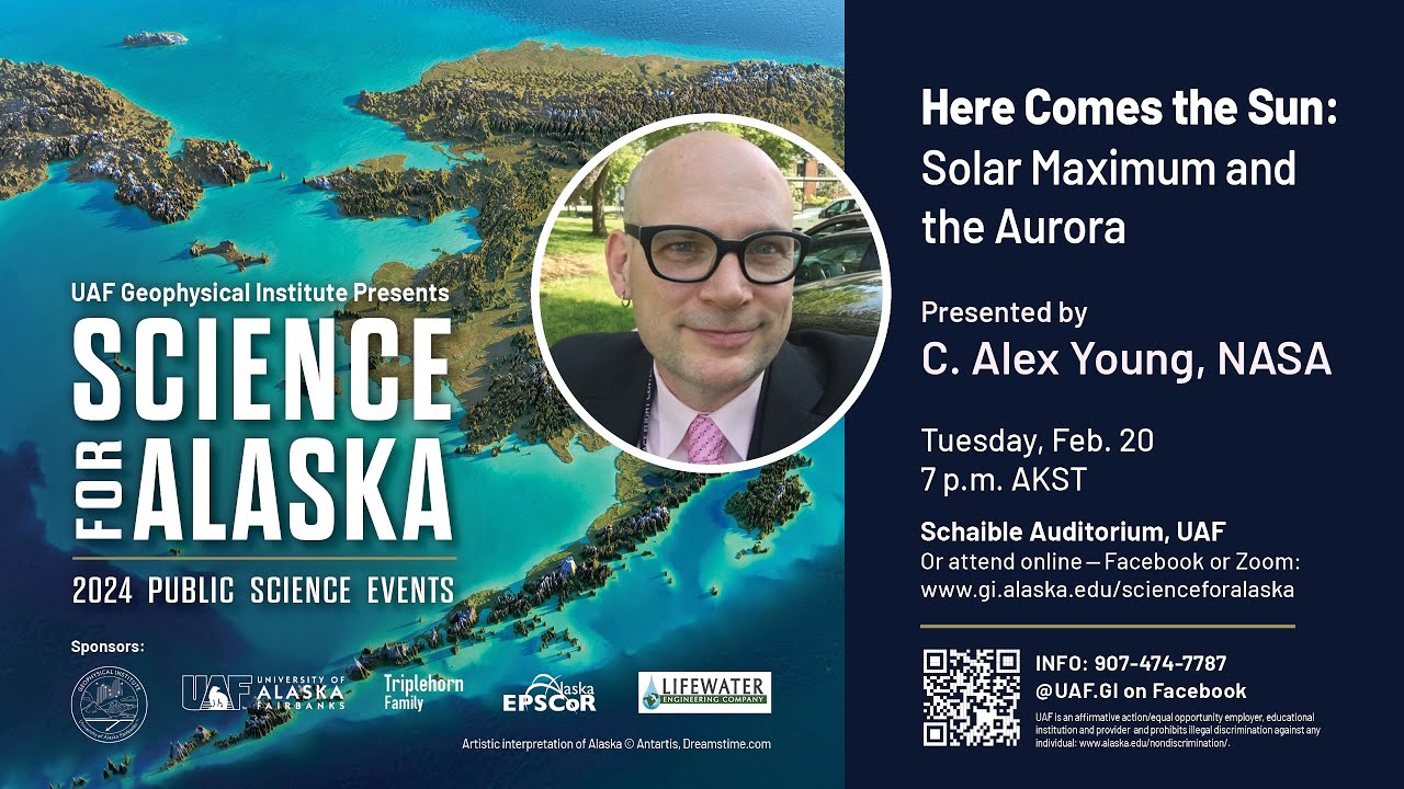 February 20, 2024 – Fairbanks Alaska – If you’re currently living in Alaska, and even if you’re located elsewhere, you may have heard that the sun is entering a period known as the “solar maximum,” and that this will have implications for aurora viewing. But exactly how are the two connected? In this Science for Alaska talk, C. Alex Young discusses heliophysics and how solar activity affects Earth infrastructure and aurora viewing. C. Alex Young, associate director for science, Heliophysics Science Division of NASA, presented the talk “Here Comes the Sun: Solar Maximum and the Aurora” on Feb. 20, 2024, in Fairbanks, Alaska, and virtually as part of the 32nd annual Science For Alaska talk series. View more information and talk summary.