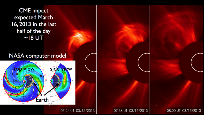 Look at for Aurora tonight and tomorrow at high latitudes! Yesterday’s coronal mass ejection (CME) is expected to sweep past Earth in the last half of today (March 16, 2013) sometime around 18UT (+- 7-8 hours). Forecasts are from minor […]