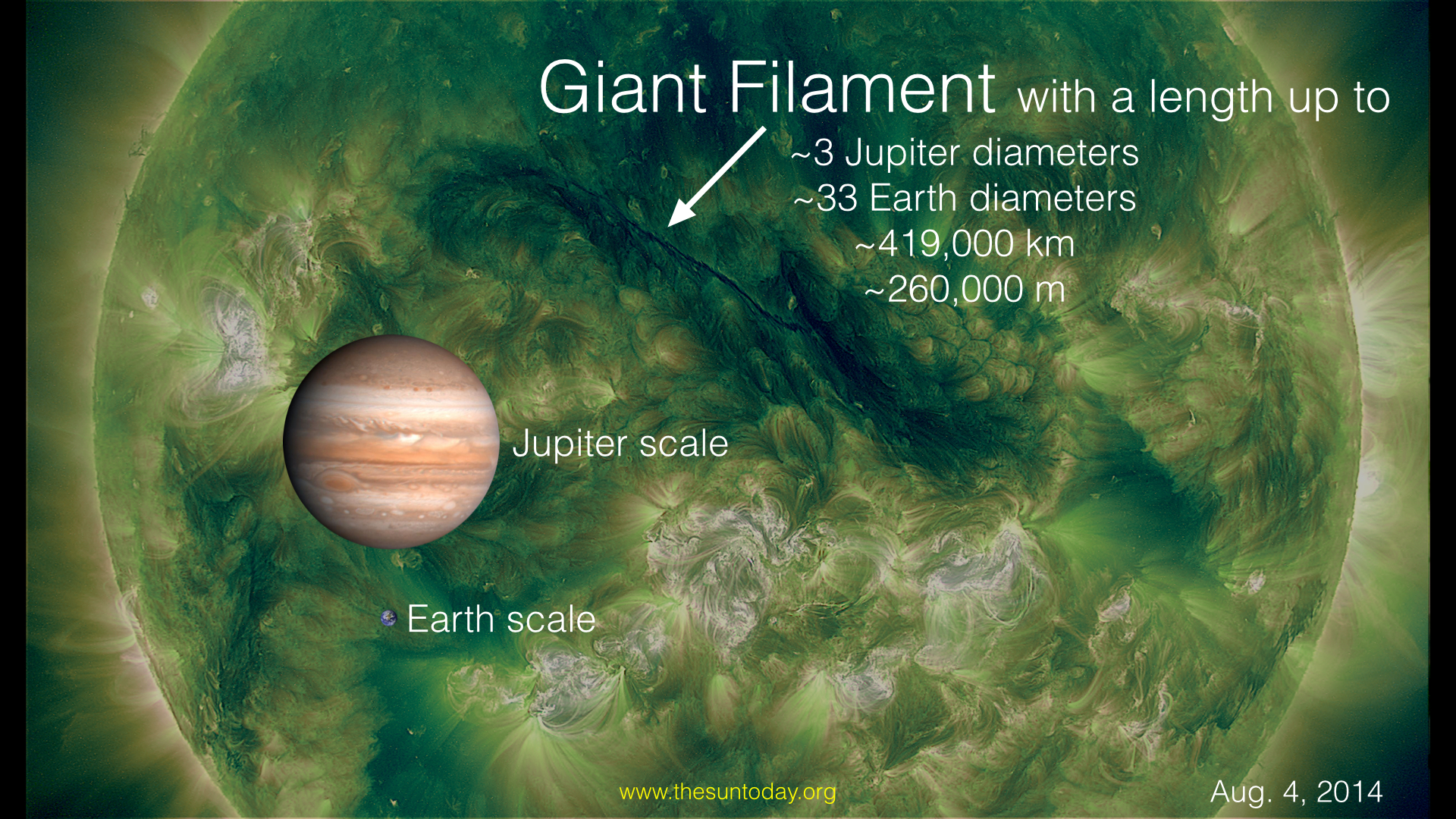 The filament is a mind boggling 3 Jupiter diameters or 33 Earth diameters or 419,000 km or 260,000 miles long. credit: NASA/SDO/helioviewer/solarmonitor.org