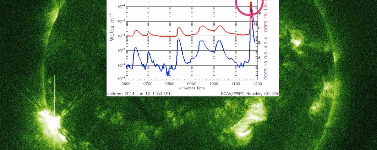 The flare peaked in x-rays around 11:42 UT. Here is a snapshot from the SDO/AIA 94 angstrom channel with the GOES x-ray plot overlayed. The flare is so bright that it causes a diffraction pattern (cross shape) in the image. This wavelength shows plasma around 6 million Kelvin or 10.8 million Fahrenheit. NOAA issued an R3 level radio blackout, which is centered on Earth were the sun is currently overhead (North Africa). This temporary blackout is caused by the heating of the upper atmosphere from the flare. The blackout level is now at an R1 and this will soon pass. Other than the temporary radio blackout for high frequencies centered over Africa this event will not have a direct impact on us. We await more data concerning a possible CME but anything would more than likely not head directly towards Earth. credit: NASA/NOAA/SDO/GOES