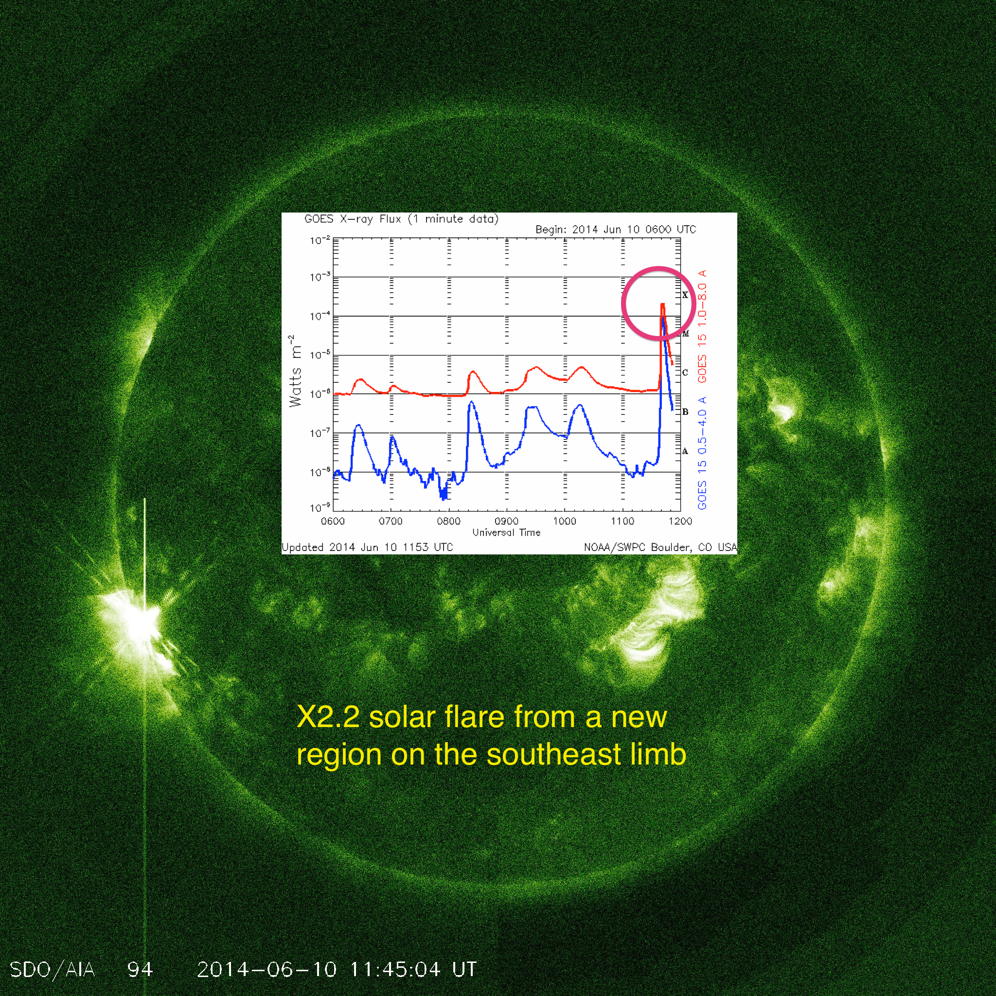 An X2.2 solar flare from a new region (AR12087) on the southeast limb is underway.