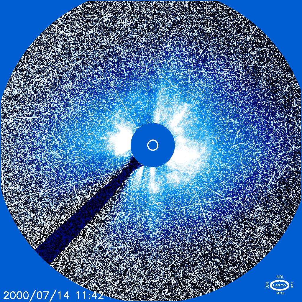 In short, we expect strong particle storms from large and fast events. But in this case, the particles that flowed over SOHO in this image were accelerated by fairly slow CMEs, as well as a solar flare on the sun.