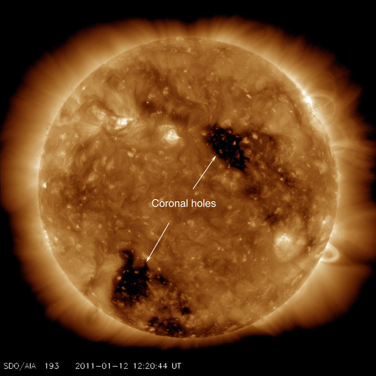 Coronal Holes are areas on the Sun that appear dark when observed in Extreme Ultraviolet and x-ray light. They are regions where the magnetic field on the solar surface opens up into space making it easier for coronal material to escape. Because these areas have less corona, they have less material to emit light and so appear dark compared to the rest of the corona. Coronal holes are where the high-speed solar wind originates. They occur mostly near the north and south poles but they can occur at other places on the solar disk.