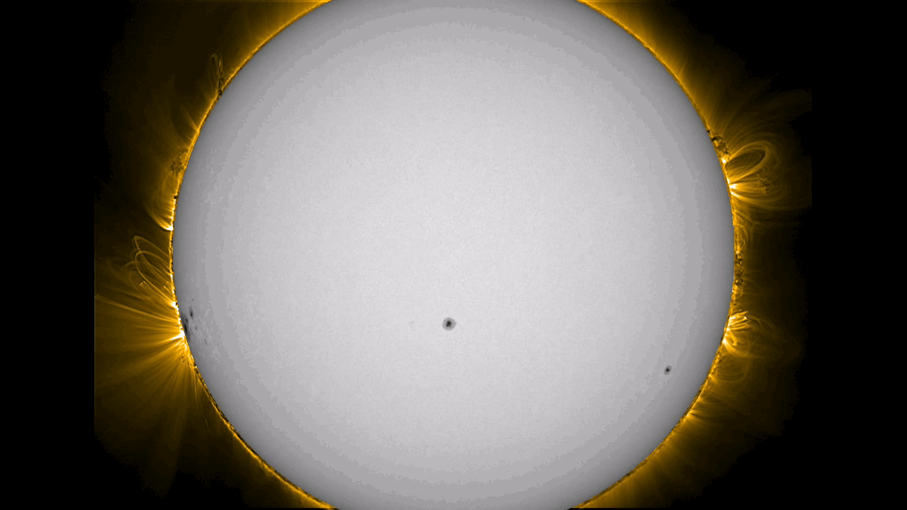 The animated gif below shows the region rotating onto the disk as observed by NASA’s SDO spacecraft. The image at the center is a visible light image from the HMI instrument. The images are overtop of the AIA 171 angstrom wavelength channel. This makes a halo around the HMI images. The AIA images show 600,000 Kelvin plasma which traces out magnetic loops.